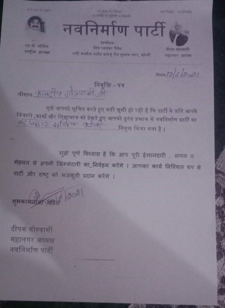 नव निर्माण पार्टी के राष्ट्रीय अध्यक्ष एम पी कौशिक जी के निर्देश अनुसार उत्तर प्रदेश के प्रदेश अध्यक्ष दिवाकर गोस्वामी ने कई जिलों के जिला अध्यक्ष नियुक्त किए इस मौके पर सुमित गोस्वामी जी को संभल जिले का जिला अध्यक्ष अमित गिरी संभल जिला अध्यक्ष युवा मोर्चा आनंद गोस्वामी मंडल प्रमुख महासचिव बनारसी शरद कुमार जी को मंडल अध्यक्ष बनारस सूरज गिरी को प्रदेश सचिव की जिम्मेदारी दी है दुष्यंत चौहान जी को प्रदेश सचिव बनाया गया है सुरजीत कुमार सिंह सुल्तानपुर का जिला अध्यक्ष बनाया गया सत्येंद्र गिरी जिला प्रभारी देवरिया सत्यदेव सिंह महानगर अध्यक्ष नोएडा रोहित गिरी जिला अध्यक्ष बदायूं की जिम्मेदारी दी गई प्रदेश अध्यक्ष ने सभी को बधाई दी एवं जल्द से जल्द अपनी टीम का गठन करने का निर्देश दे दिया अनेकों पार्टी और संगठन छोड़ कर आए नवनिर्माण पार्टी में विश्वास जताते हुए इन लोगों ने नव निर्माण पार्टी की सदस्यता ग्रहण की अधिकतम युवा वर्ग नवनिर्माण पार्टी में अपना विश्वास जता रहा है अनेकों युवा अन्य पार्टी को छोड़कर नव निर्माण पार्टी की जॉइनिंग ले रहे हैं बहुत जल्द पूरे उत्तर प्रदेश में संगठन का विस्तार हो जाएगा प्रदेश अध्यक्ष दिवाकर गोस्वामी सभी को निर्देश दिया कि 2022 के चुनाव के लिए अभी से कमर कस लें और पूरी मेहनत के साथ संगठन का विस्तार करें जिससे कि आने वाले 2022 के चुनाव में ज्यादा से ज्यादा युवा प्रत्याशियों को मैदान में उतारा जा सके अन्य पार्टियों से निराश होकर लोग नवनिर्माण पार्टी में आस्था जता रहे हैं 2022 के चुनाव में बहुत महत्वपूर्ण भूमिका निभाई की नव निर्माण पार्टी दिवाकर गोस्वामी इस अवसर पर राष्ट्रीय अध्यक्ष जी के अनुसार दिए गए सभी पदों पर लोगों को पदों का वितरण किया गया धन्यवाद